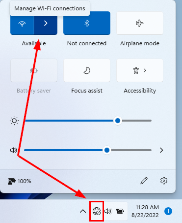 Windows 10 With the WiFi box clicked, the list of nearby networks will appear above. | Windows 11 Click the > next to the WiFi symbol for the list of nearby networks |