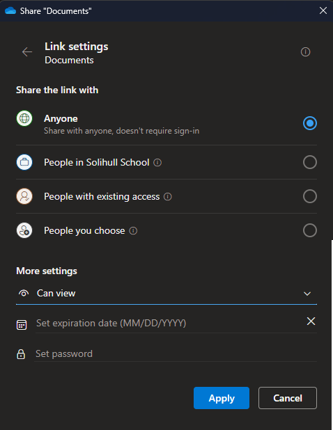 To share with individuals, groups, or all within the Solihull School organisation only.
