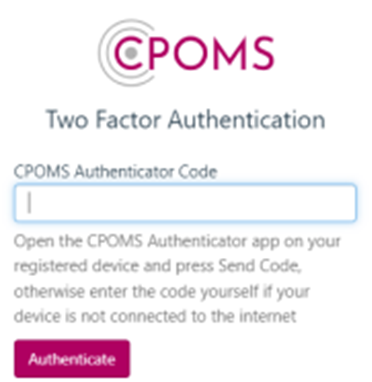 When you next log into CPOMS you will be asked to authenticate using the app. When prompted, please enter the six-digit code from your app and click ‘Authenticate’.