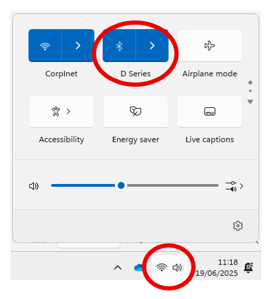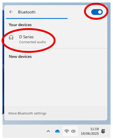Click on the speaker icon to the bottom right. The Bluetooth icon should be solid blue and say ‘D-Series’.